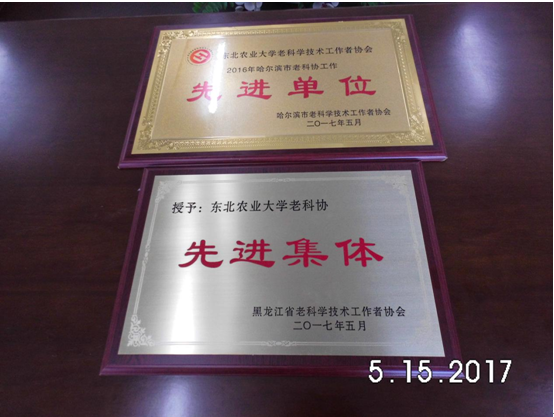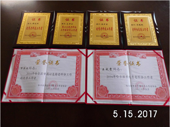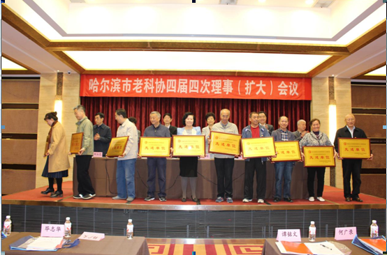 ·最后,表彰奖励了2016年度,市老科协工作先进集体和个人,我校老科协荣获“哈尔滨市老科协工作先进单位”。我校受表彰先进个人有:哈尔滨市优秀老科技工作者王成贵,哈市热心支持老科协工作的优秀工作者万庆生,哈尔滨市优秀老科技工作者吴宗璞、刘德玉,百威英博优秀科普报告员金长城和李桂英。会长王成贵代表大家上台领了证书及奖牌。