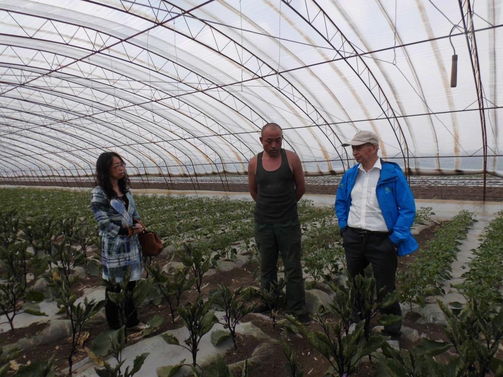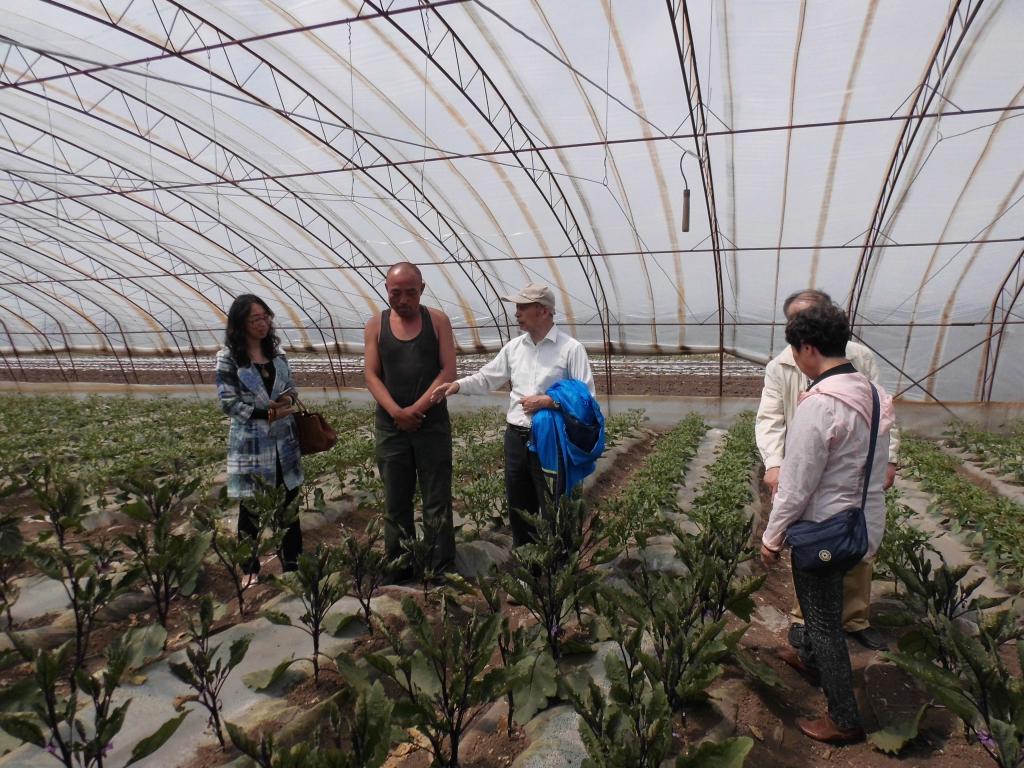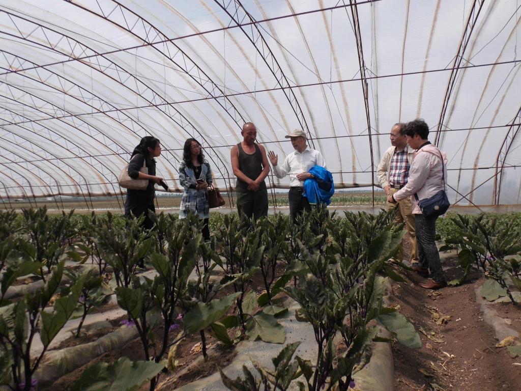 在村党支部书记和村主任带领下,大家先看了几家蔬菜栽培户大棚和露地菜。他们大棚少、规模也小一些,家中主要劳力外出打工,在栽培技术方面存在一些问题。主要是秧苗质量未达标准、水肥管理不到位、棚室温度调控不及时和栽培密度不够等。专家教授们都细心给予指导。最后又来到蔬菜栽培大户朱成纲家大棚,他和爱人及老父亲都在大棚内忙碌着,印象中他是上次讲课时认真听讲并请教问题最多的那位菜农。他家栽种三栋大棚和十亩露地蔬菜,大棚内西红柿、茄子、豆角、辣椒秧苗长势喜人,有的都已开花见果了,都在覆盖地膜和实行膜下滴灌,管理也很到位,春白菜已开始收获上市了。在喜悦同时也有忧虑和担心,因为茄子辣椒已发现了病害;茄子棵基部叶片半边发黄;茄子叶片上竖着长,叶片不展开,辣椒叶片变小萎缩等。李景富教授经仔细查看,诊断为茄子黄萎病(农村也叫半边风),是一种传染病,如不及时控制,则易传染蔓延,建议用多菌灵灌根防治。另外,茄子辣椒已受病毒病侵染,主要是棚内温度过高,建议加大通风量并结合灌水降温来减轻病害。李教授还指出,辣椒是浅根系作物,栽培密度过稀易产生落花、落叶、落果,要适当增加密度或一埯双株。茄子适当增加密度,可增加产量和促进成熟,能提前收获上市,提高经济效益,茄子苗期生长缓慢,可适当增加育苗天数,培育壮苗大苗。农户们都一一记下了。临行前,教授们还与农民互留电话加了微信,表示有什么问题,可以随时联系,及时解决。