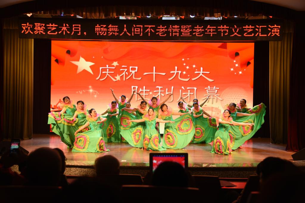 演出在动感十足的舞蹈《盛世花开》中拉开帷幕,技艺精湛的柔力球表演《蝶儿飞》、韵味十足的老年大学模特表演《水墨亭园》及模特协会的《秋雨润夕阳》,带给老同志们一幅幅唯美的艺术画面。歌伴舞《再唱山歌给党听》和老年大学舞蹈班的《为祖国干杯》用心声歌唱祖国、歌颂党,为庆祝十九大的胜利闭幕献礼。王兆老先生们表演了小合唱《长江之歌》、《红旗颂》,其中队员最高龄92岁,他们的精神和毅力赢得了在场老同志的热烈掌声。快乐活泼的三句半表演《快乐俏夕阳》一度将演出推向高潮,最后由器乐协会和艺术学院学生表演的民乐合奏《彩云追月》、《欢乐颂》及声乐协会的大合唱表演老歌新唱《敖包相会》、《康定情歌》,两个参演人员最多、最大型的节目震撼全场,歌声鼓舞人心,旋律振奋人心,将汇演拉下帷幕。老演员们个个精神饱满,情绪激昂,充分展示了我校老同志阳光、快乐的精神风貌,整个现场喜庆祥和、欢乐融融,他们用歌声和舞蹈表达出对生活的热爱,对伟大祖国的祝福之情。
