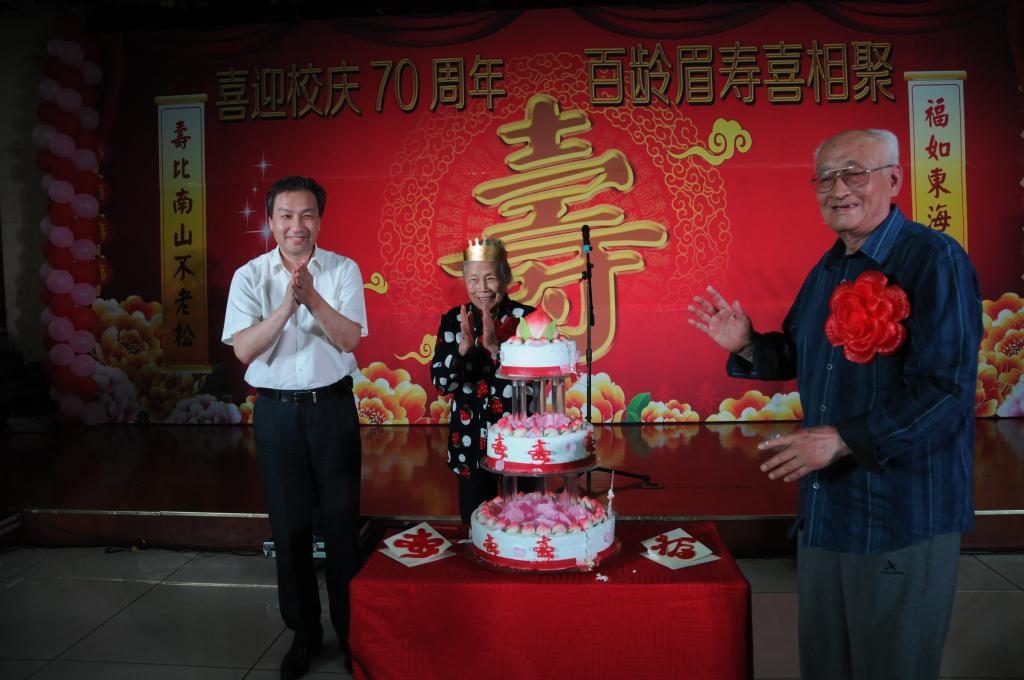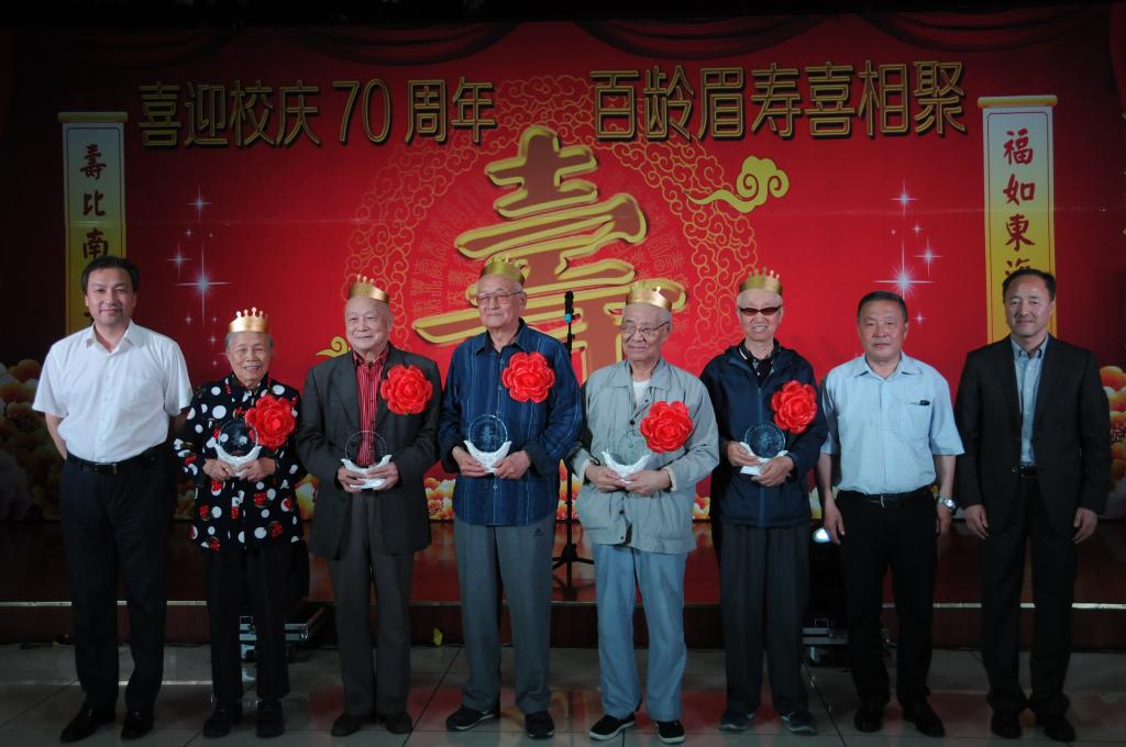 德高望重仁者寿,老如松柏岁长春。在喜迎校庆70周年之际,我校离退休人员工作处举办“喜迎校庆70周年 百龄眉寿喜相聚”为主题的集体祝寿活动。为今年我校八十、八十五、九十岁以上的离退休老寿星们举办集体祝寿会,同时,为迎接我校70周年校庆,邀请已来校70年的老先生们一起参加这个庆典仪式。校党委书记孙登林,党委副书记、校长包军,党委副书记马宏坤,亲临庆典现场,为老寿星们祝寿,和老先生们共同度过了一段温馨而难忘的美好时光。