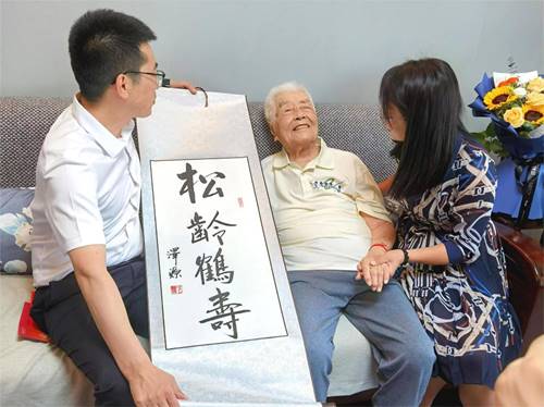 马海鹍送上由已退休原教务处处长于泽源书写的“松龄鹤寿”书法条幅,转达了教务系统对李淑云老师百岁寿辰的衷心祝贺,感谢其为学校教材工作、教务工作作出的宝贵贡献。