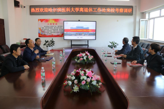 10月11日,哈尔滨医科大学离退休工作处副处长王冬梅、基础医学院工会主席周贵生一行来到我校离退休工作处开展调研交流。学校党委副书记贺景平,离退休工作处处长兼党委书记李荣军及相关同志陪同调研。
