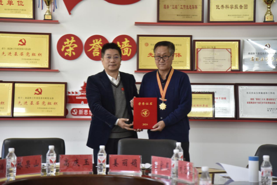 贺景平为我校荣获“2024年中国老科协技术工作者协会科学技术奖”的杨兴武同志颁发奖励证书和奖章。