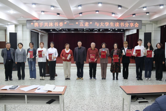 11月5日下午,学校关工委在学校离退休职工活动中心多功能厅举办了“携手共沐书香”——“五老”与大学生读书分享会活动。学校关工委常务副主任、原校党委副书记胡国良,校关工委秘书长、离退休工作处处长兼党委书记肖冬梅,校关工委副秘书长、离退休工作处副处长孙喜娟,学校“五老”人员代表、经济管理学院和国际文化教育学院的师生代表共同参与读书分享会。