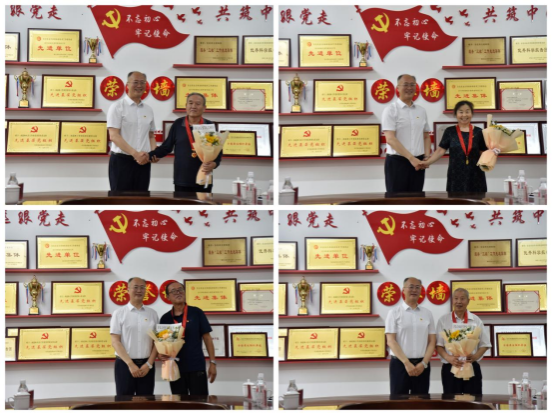 付强代表学校党委为出席仪式的8名党龄满50年的老党员颁发了“光荣在党50年”纪念章并赠送鲜花。